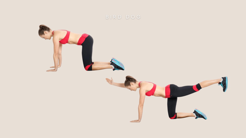 HELPS WITH : The bird dog teaches you to engage your abdominals and stabilize your low back while moving your extremities